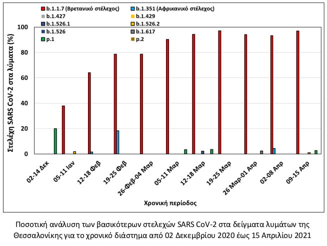 Όπως φαίνεται στα διαγράμματα που παρουσιάζει το ΑΠΕ-ΜΠΕ, το διάστημα από 19 έως 25 Μαρτίου η επικράτηση του βρετανικού -πολύ πιο μεταδοτικού στελέχους του ιού- αγγίζει το 100%, έχοντας κυριαρχήσει απόλυτα έναντι άλλων ευρέως διαδεδομένων στην παγκόσμια κοινότητα μεταλλάξεων, όπως η νοτιοαφρικανική, η οποία μόνο το διάστημα 19-25 Φεβρουαρίου πλησιάζει στο 20% κι επανεμφανίζεται το διάστημα 2-8 Απριλίου σε ποσοστό μικρότερο του 5%. Οι τελευταίες μετρήσεις, μέσω της ανάλυσης των γονιδιωμάτων του ιού στα λύματα, αφορούν την εβδομάδα 9-15 Απριλίου και δείχνουν επικράτηση του βρετανικού στελέχους σε ποσοστό που αγγίζει και πάλι το 100%.