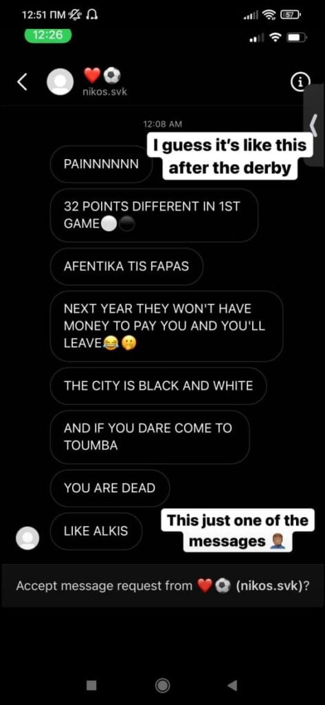 Ο Αμερικανός φόργουορντ εξεπλάγην κι έγραψε… «να φανταστώ ότι αυτό συμβαίνει μετά από κάθε ντέρμπι. Αυτό είναι απλά ένα από τα μηνύματα», εννοώντας ότι έχε δεχθεί κι άλλα αντίστοιχα μηνύματα.