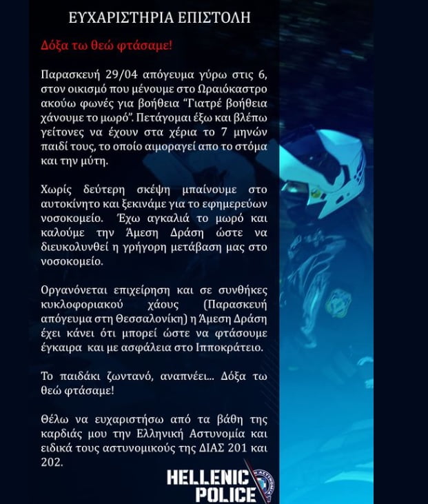 «Το παιδάκι ζωντανό, αναπνέει… Δόξα τω Θεώ φτάσαμε», γράφει ο ίδιος με τεράστια ανακούφιση και ευγνωμοσύνη για τη βοήθεια που προσέφεραν οι άνδρες της Αστυνομίας.