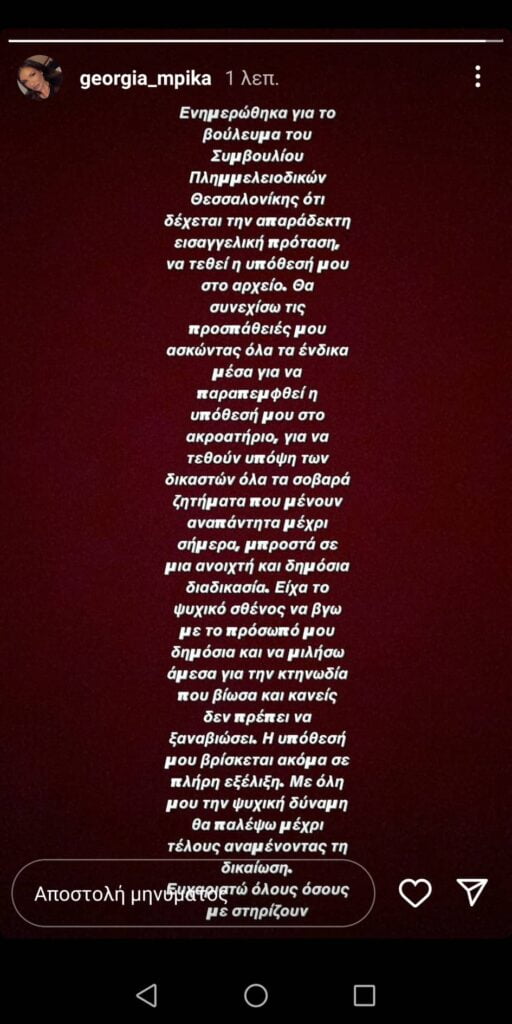 Στην ανάρτησή της η Γεωργία Μπίκα σημειώνει επίσης: “Με όλη μου την ψυχική δύναμη θα παλέψω μέχρι τέλους αναμένοντας τη δικαίωση.”