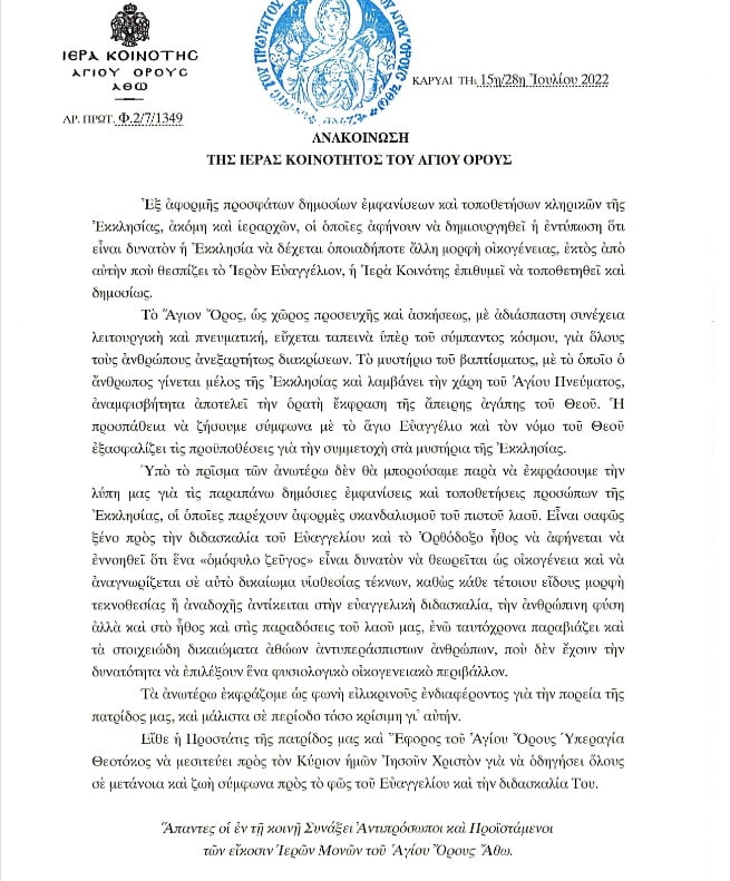 “Εξ αφορμής προσφάτων δημοσίων εμφανίσεων και τοποθετήσων κληρικών της Εκκλησίας, ακόμη και ιεραρχών, οι οποίες αφήνουν να δημιουργηθεί η εντύπωση ότι είναι δυνατόν η Εκκλησία να δέχεται οποιαδήποτε άλλη μορφή οικογένειας, εκτός από αυτήν που θεσπίζει το Ιερόν Ευαγγέλιον, η Ιερά Κοινότης επιθυμεί να τοποθετηθεί και δημοσίως.