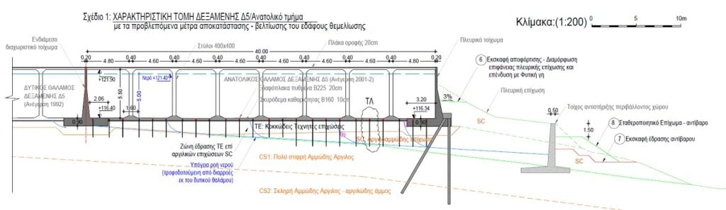 Η δίχωρη δεξαμενή Δ5 πάνω από την περιφερειακή οδό στον Δήμο Ευόσμου άρχισε να κατασκευάζεται το 1992, οπότε και ολοκληρώθηκε ο πρώτος, δυτικός θάλαμός της. Το 2001 κατασκευάστηκε και ο δεύτερος, ανατολικός θάλαμος, ο οποίος ουσιαστικά δεν λειτούργησε ποτέ λόγω των μεγάλων καθιζήσεων που εκδηλώθηκαν οδηγώντας σε εκτεταμένες ρηγματώσεις. Η εξειδικευμένη γεωτεχνική και στατική μελέτη που εκπονήθηκε επιβεβαίωσε τις αρχικές εκτιμήσεις της ΕΥΑΘ ότι το μεγάλου ύψους επίχωμα επί του οποίου θεμελιώθηκε η δεξαμενή, έχει εν μέρει αστοχήσει. Η μελέτη επέμβασης και αποκατάστασης περιλαμβάνει τσιμεντενέσεις βάθους 3,30 μ. σ’ έναν κάνναβο περίπου 1,50 μ. (απόσταση 1,50Χ1,50 μ.), έτσι ώστε να διασφαλιστεί η θεμελίωση της δεξαμενής. Επιπλέον, προβλέπεται η αποκατάσταση του φορέα οπλισμένου σκυροδέματος, με επισκευή των ρηγματώσεων και των τοπικών οξειδώσεων των οπλισμών κι εσωτερική επένδυση της δεξαμενής με σύστημα οπλισμένης μεμβράνης, η οποία δεν επικολλάται στο οπλισμένο σκυρόδεμα, αλλά είναι κρεμασμένη από την οροφή. Το πρωτοποριακό αυτό σύστημα μόνωσης εφαρμόστηκε ήδη πιλοτικά από την ΕΥΑΘ στη δεξαμενή της Ευαγγελίστριας με μεγάλη επιτυχία, μηδενίζοντας τις απώλειες νερού.