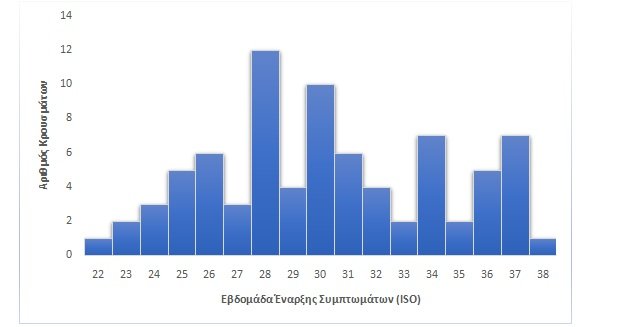 Ο συνολικός αριθμός των εργαστηριακά επιβεβαιωμένων κρουσμάτων από την έναρξη της καταγραφής ανέρχεται σε 80 (όλοι άνδρες, διάμεση ηλικία: 36 έτη (19-61), εκ των οποίων 20 ανέφεραν ταξίδι στο εξωτερικό εντός του χρόνου επώασης της νόσου (25%). Η χρονική κατανομή των εργαστηριακά επιβεβαιωμένων κρουσμάτων ανά εβδομάδα έναρξης συμπτωμάτων (εβδομάδα κατά ISO) παρουσιάζεται στο παρακάτω Γράφημα.