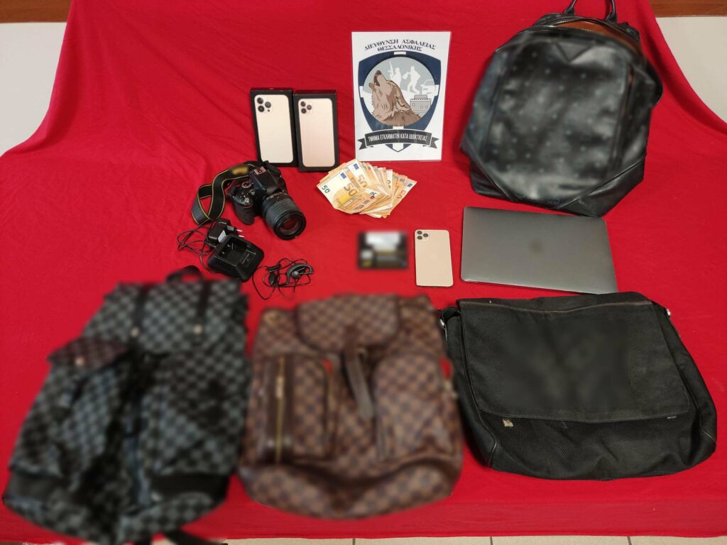 Σε έρευνες στις οικίες τους εντοπίστηκαν χρήματα, κινητά τηλέφωνα, κλεμμένο όπλο, γυναικείες τσάντες και κοσμήματα. Μάλιστα, κατασχέθηκε και μια ατζέντα, στην οποία αναγράφονταν οι κωδικοί κλήσεων των εποχούμενος περιπολιών της Διεύθυνσης Άμεσης Δράσης Θεσσαλονίκης.