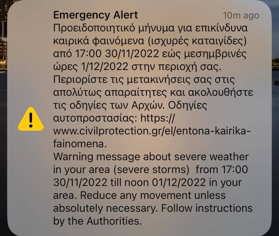 «Περιορίστε τις μετακινήσεις σας στις απολύτως απαραίτητες και ακολουθήστε τις οδηγίες των Αρχών», αναφέρει το μήνυμα.