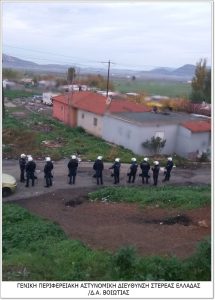Στην επιχείρηση συμμετείχαν Αστυνομικοί της Διμοιρίας Υποστήριξης, των Τμημάτων Ασφαλείας Θηβών και Λιβαδειάς, του Αστυνομικού Τμήματος Θηβών, δύο Ο.Π.Κ.Ε. και μία Ο.Ε.Π.Τ.Α. της Διεύθυνσης Αστυνομίας Βοιωτίας, συνεπικουρούμενοι από τέσσερις Ο.Π.Κ.Ε. των Διευθύνσεων Αστυνομίας Ευβοίας, Φθιώτιδας και Φωκίδας, τη Διμοιρία Υποστήριξης της Διεύθυνσης Αστυνομίας Ευβοίας και τον αστυνομικό σκύλο ανίχνευσης ναρκωτικών ουσιών αυτής μετά του συνοδού του. Τις αστυνομικές δυνάμεις συνέδραμε δικαστικός λειτουργός.