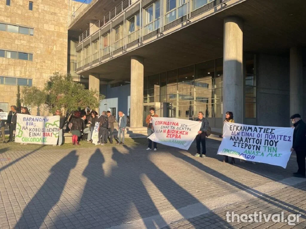 Διαμαρτυρία έξω από το δημαρχιακό Μέγαρο της Θεσσαλονίκης πραγματοποιούν αυτήν την ώρα οικολόγοι μετά τις συλλήψεις στη διαμαρτυρία ενάντια στις κοπές δέντρων το πρωί της Δευτέρας στην πλατεία Δικαστηρίων.