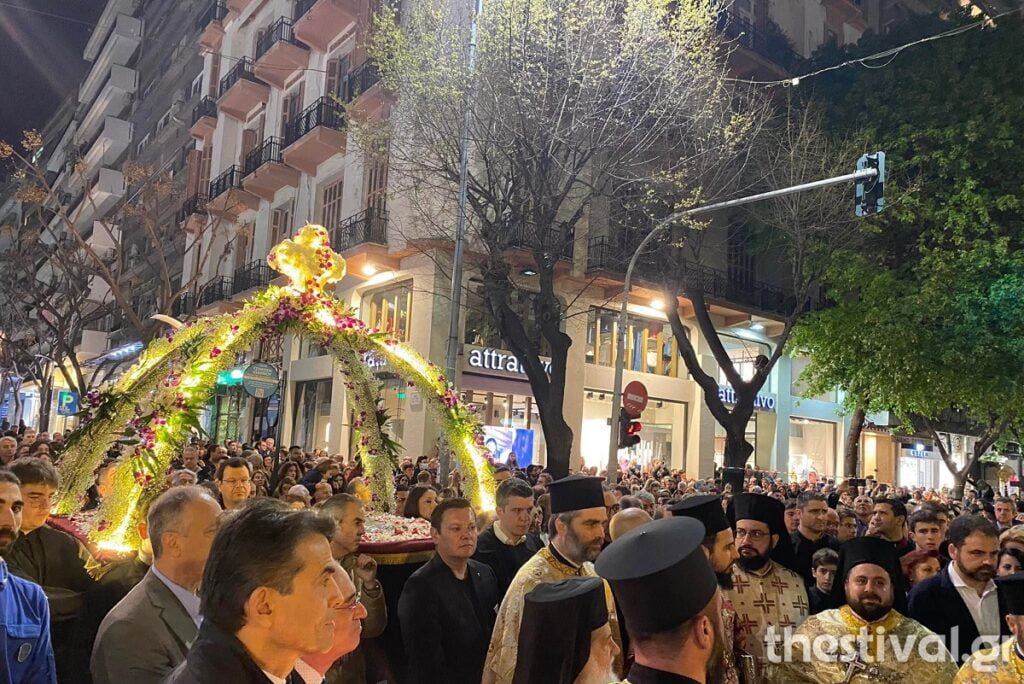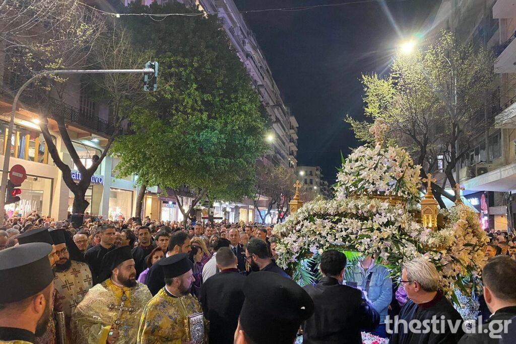 Χιλιάδες πιστοί παρακολουθούν με ευλάβεια τους ιερείς των δύο ναών να ψάλλουν τις δεήσεις της ακολουθίας του Επιταφίου στη συμβολή των οδών Τσιμισκή και Αγίας Σοφίας, στο κέντρο της Θεσσαλονίκης.