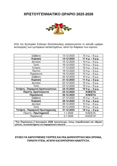 Σημειώνεται ότι τα καταστήματα στην πόλη θα είναι ανοιχτά τις Κυριακές 14, 21 και 28 Δεκεμβρίου από τις 11 το πρωί έως τις 6 το απόγευμα.