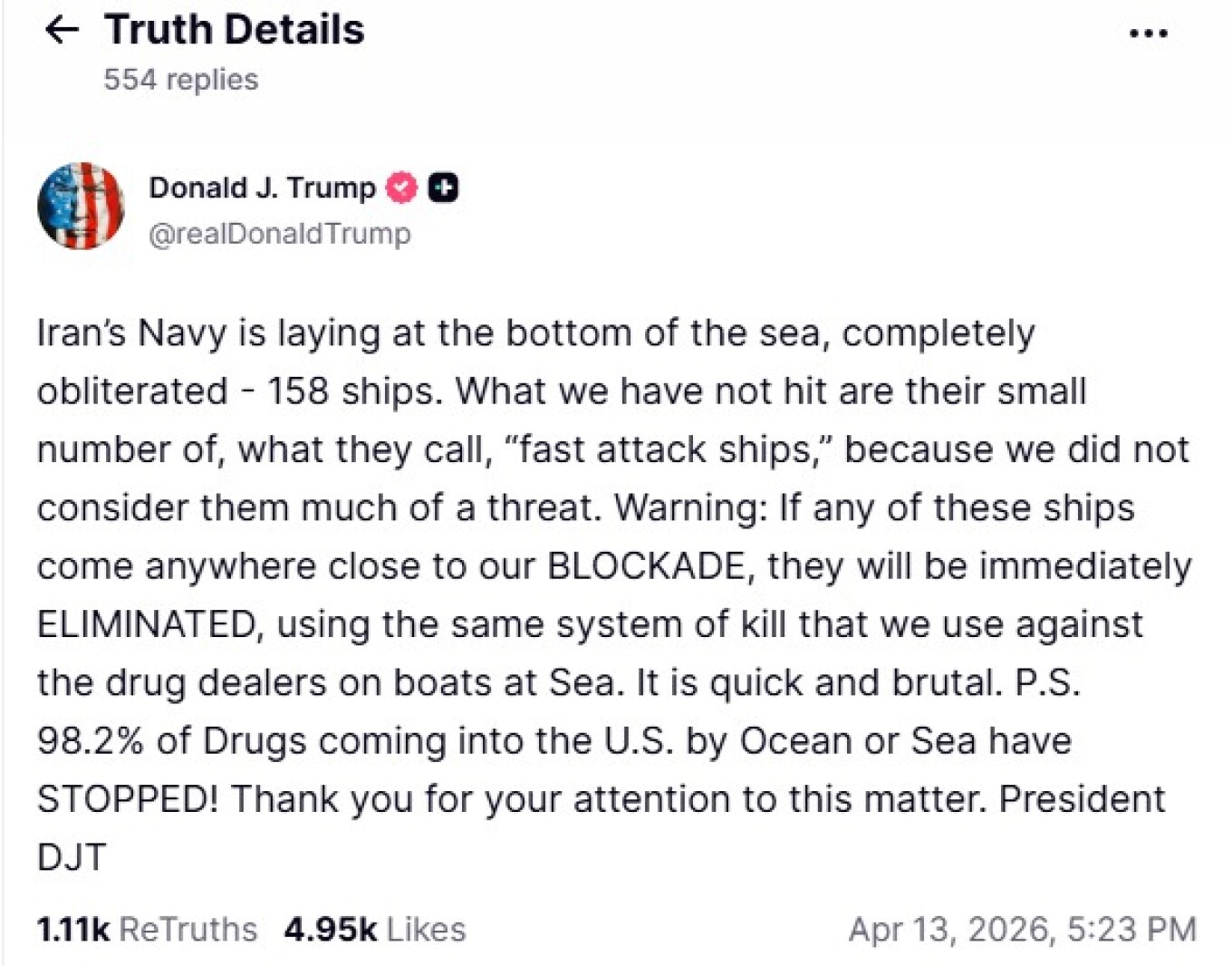 «Το Ναυτικό του Ιράν βρίσκεται στον πάτο της θάλασσας, εντελώς εξολοθρευμένο. 158 πλοία. Αυτό που δεν έχουμε χτυπήσει είναι ο μικρός αριθμός των αποκαλούμενων "πλοίων ταχείας επίθεσης", επειδή δεν τα θεωρήσαμε ιδιαίτερη απειλή. Προειδοποίηση: Εάν οποιοδήποτε από αυτά τα πλοία πλησιάσει οπουδήποτε στον ΑΠΟΚΛΕΙΣΜΟ μας, θα ΧΤΥΠΗΘΕΙ αμέσως, με το ίδιο σύστημα εξόντωσης που χρησιμοποιούμε κατά των ναρκόπλοιων. Είναι γρήγορο και βάναυσο. Υ.Γ. Το 98,2% των ναρκωτικών που εισέρχονται στις ΗΠΑ μέσω ωκεανού ή θάλασσας έχει ΣΤΑΜΑΤΗΣΕΙ! Σας ευχαριστώ για την προσοχή σας επί του θέματος».