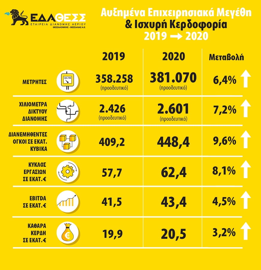 Τα αποτελέσματα της Εταιρείας αντικατοπτρίζουν την επίτευξη του συνόλου των επιχειρησιακών στόχων σε όλο το εύρος των δραστηριοτήτων της. Συγκεκριμένα, εντός του 2020 σημειώθηκε δυναμική ανάπτυξη της αγοράς, με 23.000 νέες συνδέσεις και με δείκτη διείσδυσης που υπερβαίνει το 64% του πληθυσμού των περιοχών της Αδείας. Ταυτόχρονα, οι διανεμηθέντες όγκοι ανήλθαν σε 448,4 εκατ. Nm3 αυξημένοι κατά 9,6% συγκριτικά με το 2019. Το πρόγραμμα ανάπτυξης για το 2020 ύψους 36 εκ. € υλοποιήθηκε πλήρως για την επέκταση του δικτύου διανομής και την τροφοδότηση όλων των νέων περιοχών.