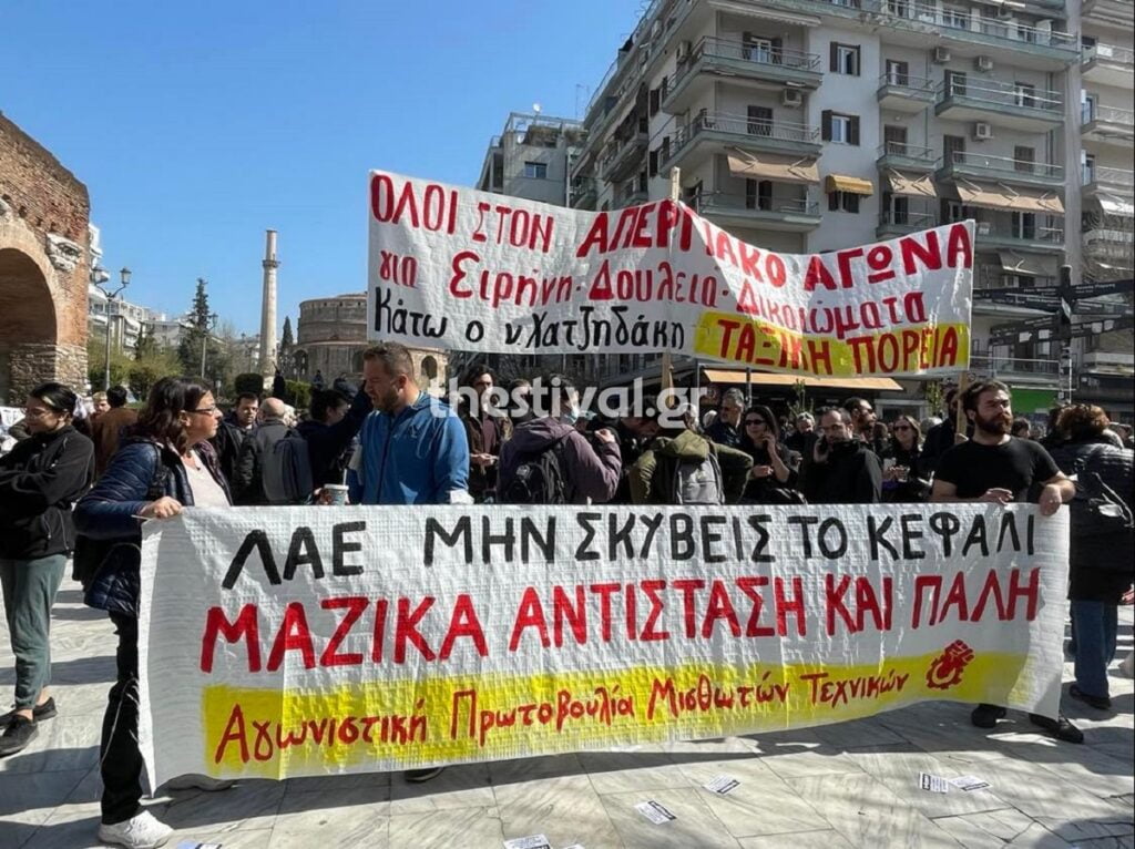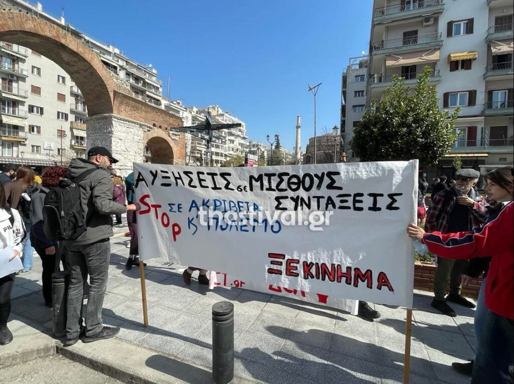 Οι διαδηλωτές έχουν συγκεντρωθεί στην πλατεία Καμάρας. «Κάτω η πολιτική της φτώχειας – ακρίβειας» και «διεκδικούμε μισθό ασφάλιση ωράριο», αναγράφουν ορισμένα από τα πανό των διαδηλωτών, που διαδηλώνουν κάτω του νόμου Χατζηδάκη.