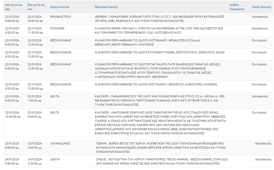 Διακοπή ρεύματος σε αρκετές περιοχές - ΠΙΝΑΚΑΣ