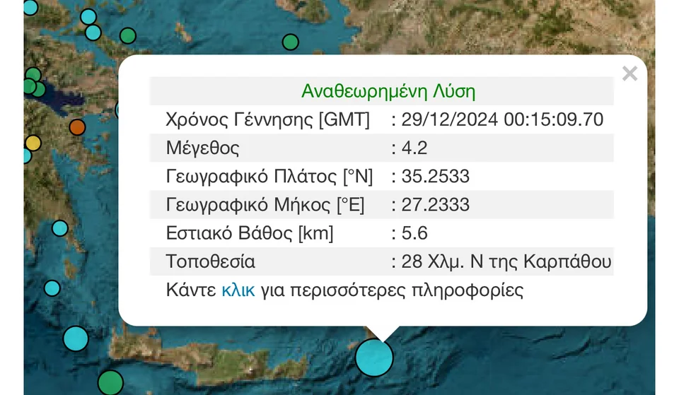 Συγκεκριμένα σεισμός 4,2 βαθμών της κλίμακας Ρίχτερ, ο οποίος χαρακτηρίζεται «ασθενής», καταγράφτηκε στις 02:15 στον θαλάσσιο χώρο 28 χιλιόμετρα νότια της Καρπάθου, ή κάπου 435 χιλιόμετρα νοτιοανατολικά της πρωτεύουσας, ανακοίνωσε το Γεωδυναμικό Ινστιτούτο του Εθνικού Αστεροσκοπείου της Αθήνας.
