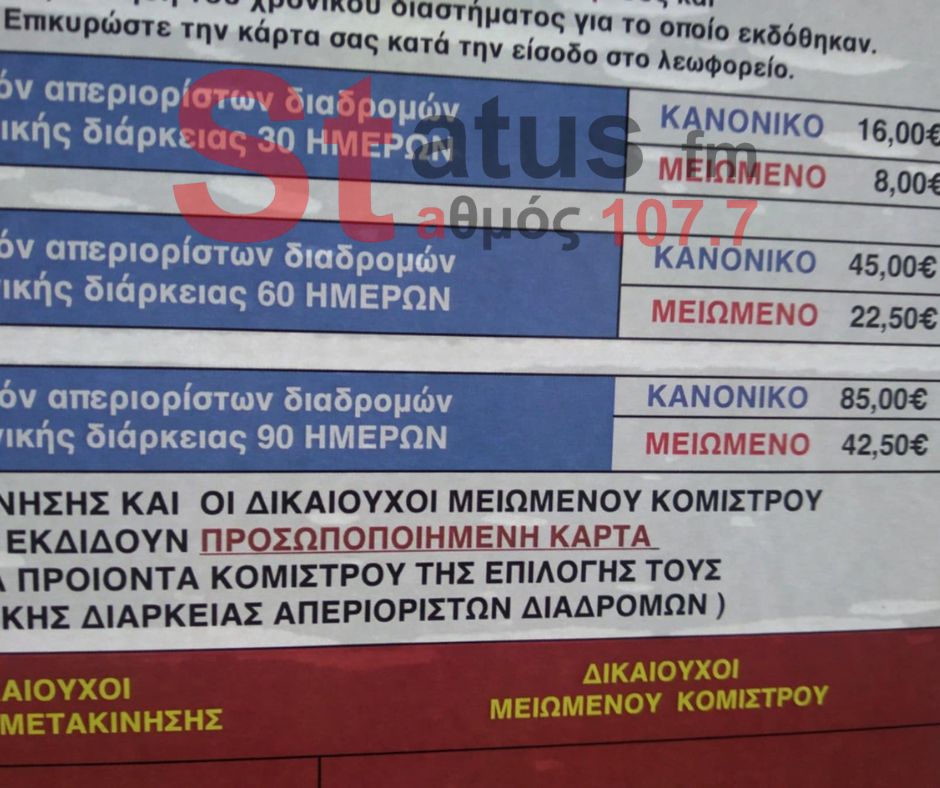 Όπως φαίνεται και στη φωτογραφία που έστειλε στον Status FM επιβάτης της γραμμής 30, οι τιμές των καρτών απεριορίστων διαδρομών είναι γραμμένες λάθος. Συγκεκριμένα αναφέρεται η ύπαρξη της κάρτας 60 ημερών με τιμή στα 45 ευρώ την ώρα που η μηνιαία κοστίζει 16 και 90 ημερών στα 85 ευρώ. Δηλαδή αντί να κερδίζει κάποιος χρησιμοποιώντας τις κάρτες για περισσότερο καιρό, ουσιαστικά πληρώνει ακριβότερα από ό,τι αν αγόραζε μηνιαία.