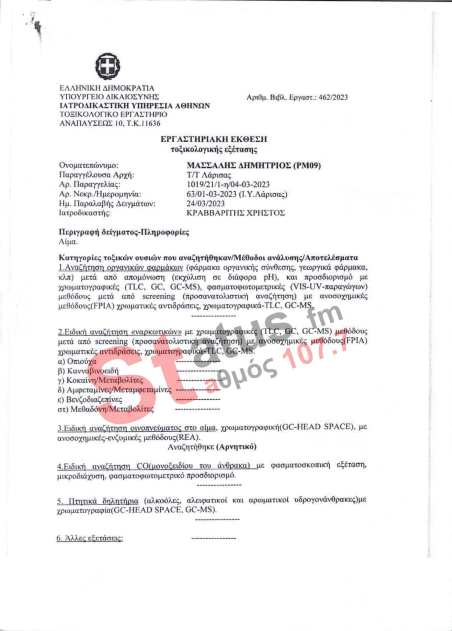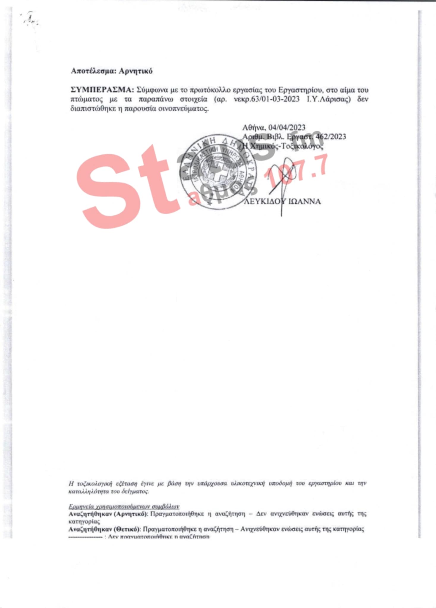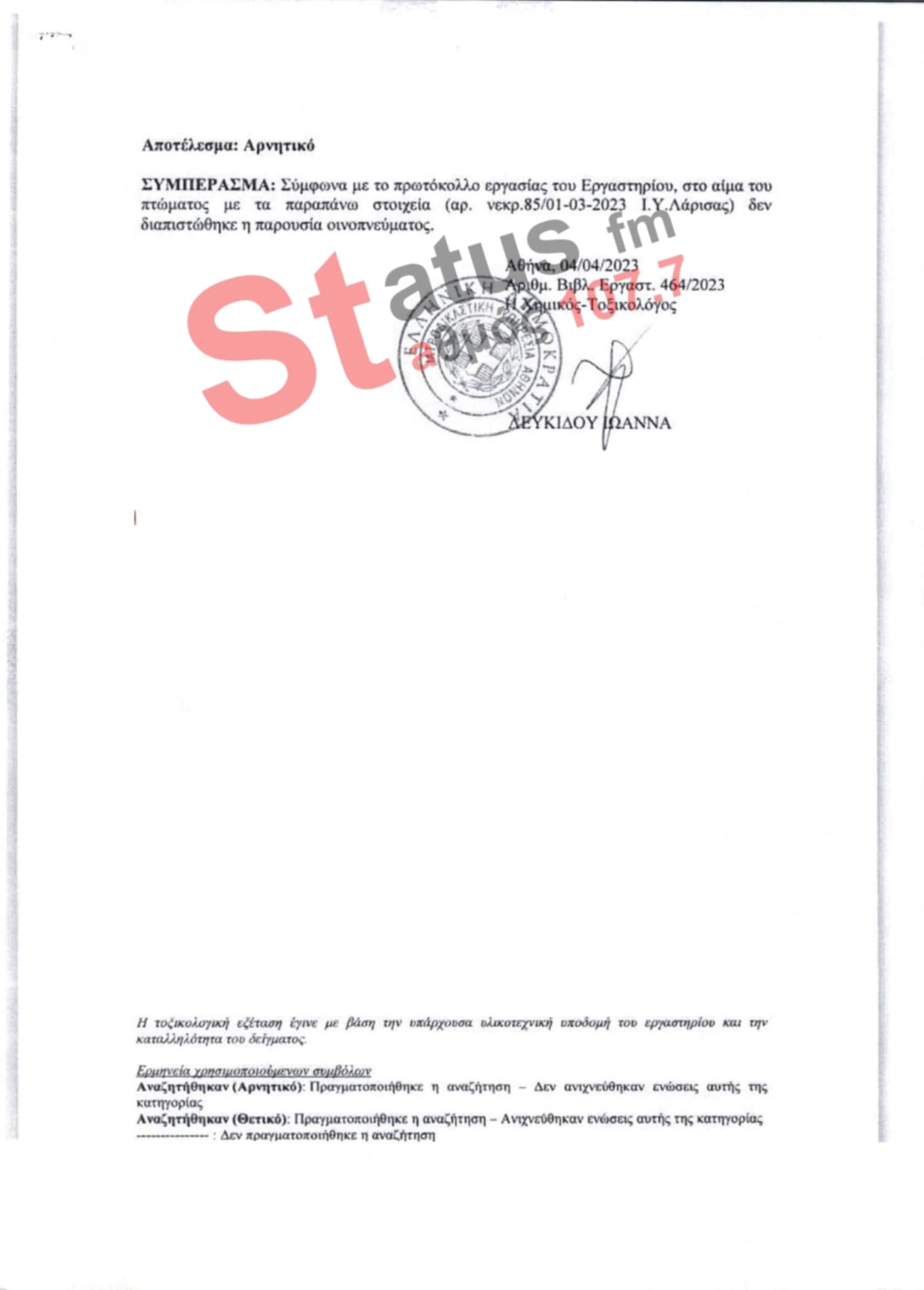Όπως δήλωσε ο κ. Μπαρτζώκης υπάρχουν τέσσερις εκθέσεις που έχουν γίνει που έχουν γίνει στην ιατροδικαστική υπηρεσία Αθηνών και αφορούν τέσσερις επιβάτες, οι οποίες δείχνουν ότι δεν υπήρχε ούτε μονοξείδιο του άνθρακα ούτε αλκοόλ. "Μάλιστα αναφέρουν στο 5% αντί για το 55 που είναι η δηλητηρίαση του ανθρώπου. Εάν υπήρχε κάτι στα θύματα θα έπρεπε να φαινότανε με αυτές τις εξετάσεις. Δεν έγιναν σε όλους τους επιβάτες, αυτό όμως δεν είμαστε εμείς αρμόδιοι για να το κρίνουμε", σημείωσε ο κ. Μπαρτζώκης.