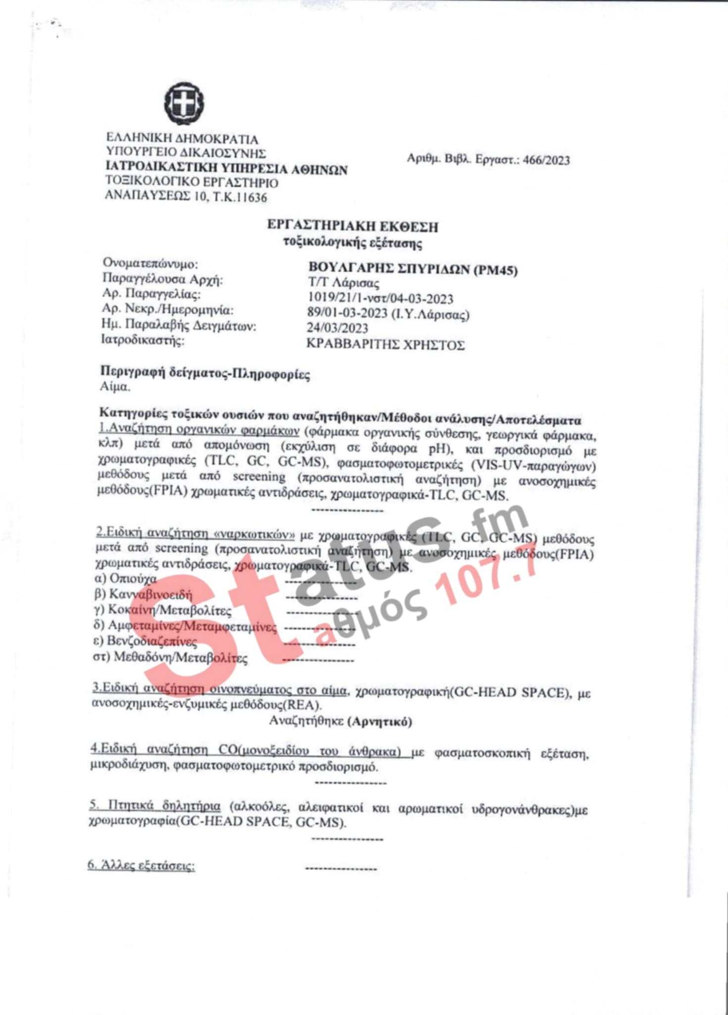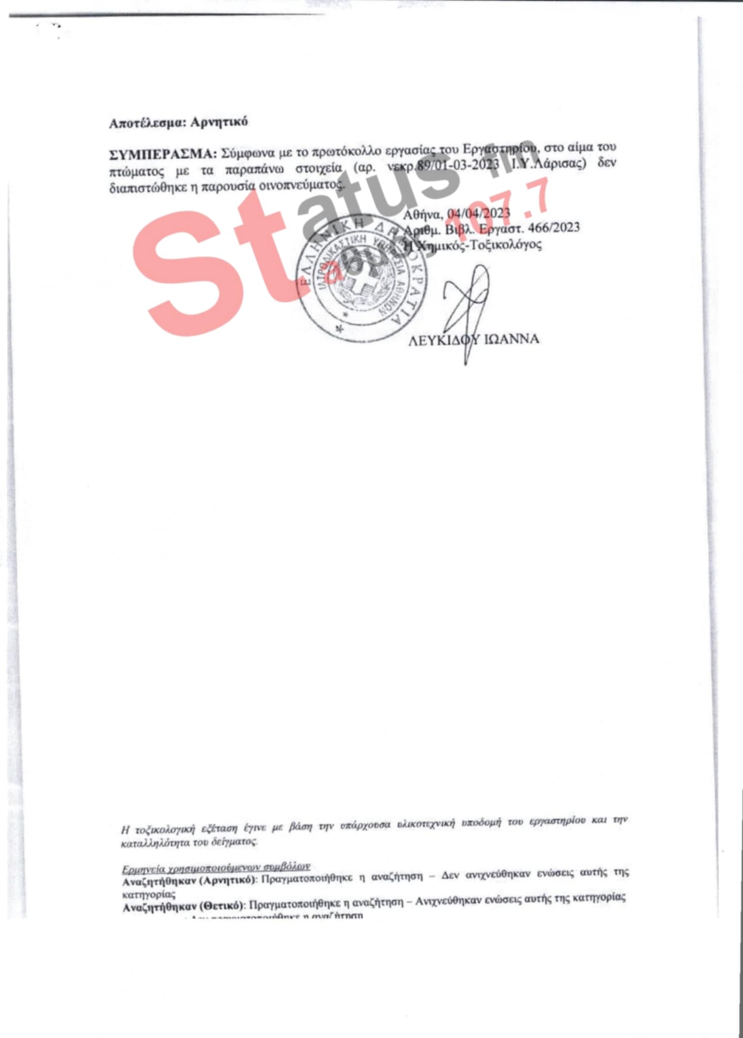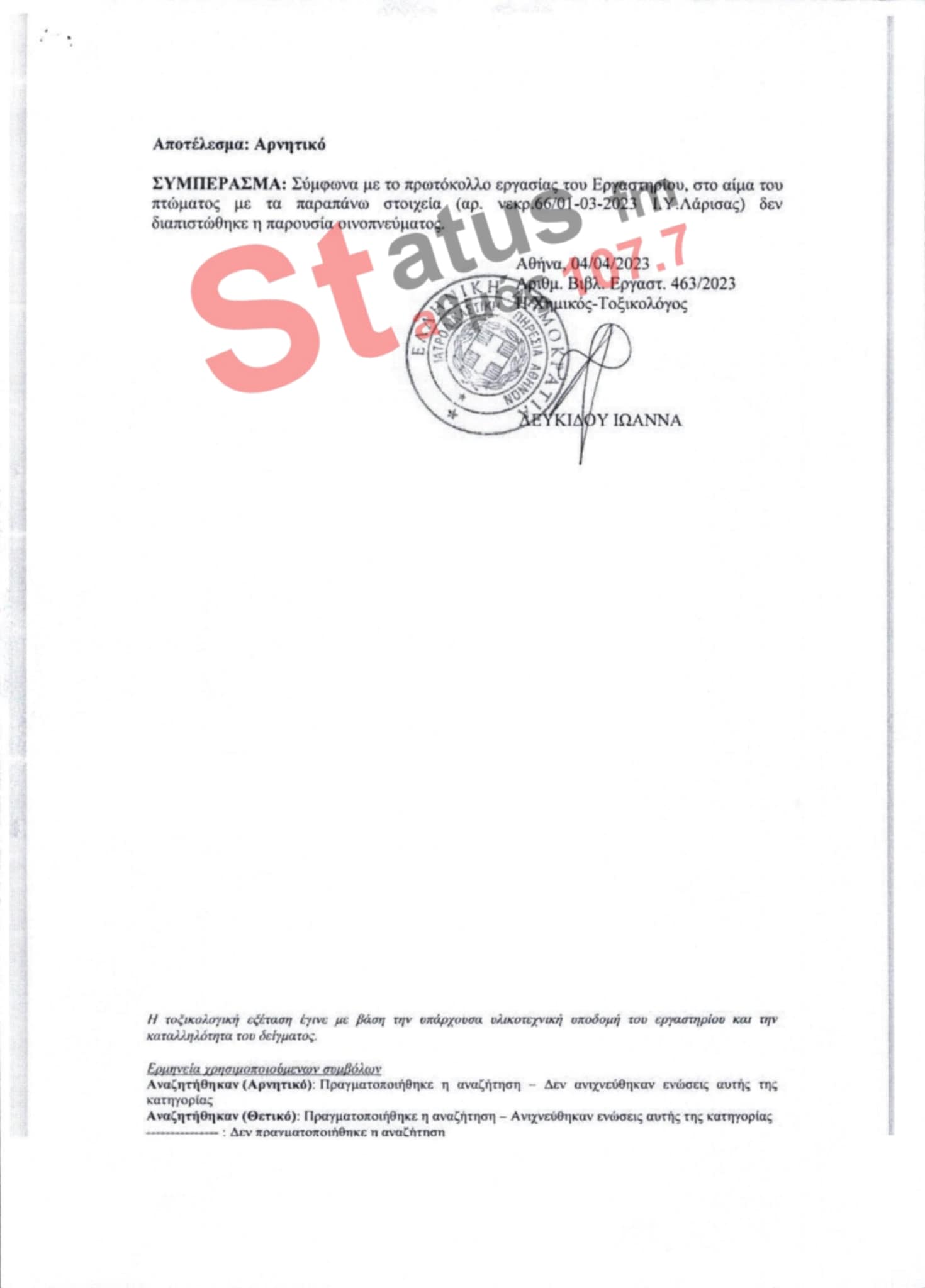 Όπως δήλωσε ο κ. Μπαρτζώκης υπάρχουν τέσσερις εκθέσεις που έχουν γίνει που έχουν γίνει στην ιατροδικαστική υπηρεσία Αθηνών και αφορούν τέσσερις επιβάτες, οι οποίες δείχνουν ότι δεν υπήρχε ούτε μονοξείδιο του άνθρακα ούτε αλκοόλ. "Μάλιστα αναφέρουν στο 5% αντί για το 55 που είναι η δηλητηρίαση του ανθρώπου. Εάν υπήρχε κάτι στα θύματα θα έπρεπε να φαινότανε με αυτές τις εξετάσεις. Δεν έγιναν σε όλους τους επιβάτες, αυτό όμως δεν είμαστε εμείς αρμόδιοι για να το κρίνουμε", σημείωσε ο κ. Μπαρτζώκης.