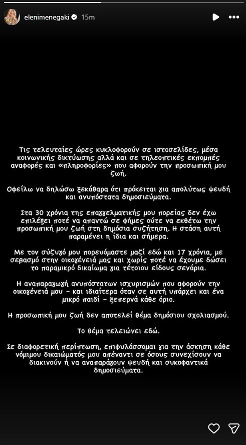 Μέσα από ανάρτηση στον προσωπικό της λογαριασμό στο Instagram, η γνωστή παρουσιάστρια ξεκαθάρισε ότι πρόκειται για «απολύτως ψευδή και ανυπόστατα δημοσιεύματα», τονίζοντας πως στα 30 χρόνια της επαγγελματικής της πορείας δεν έχει επιλέξει ποτέ να απαντά σε φήμες ούτε να εκθέτει την προσωπική της ζωή σε δημόσια συζήτηση.