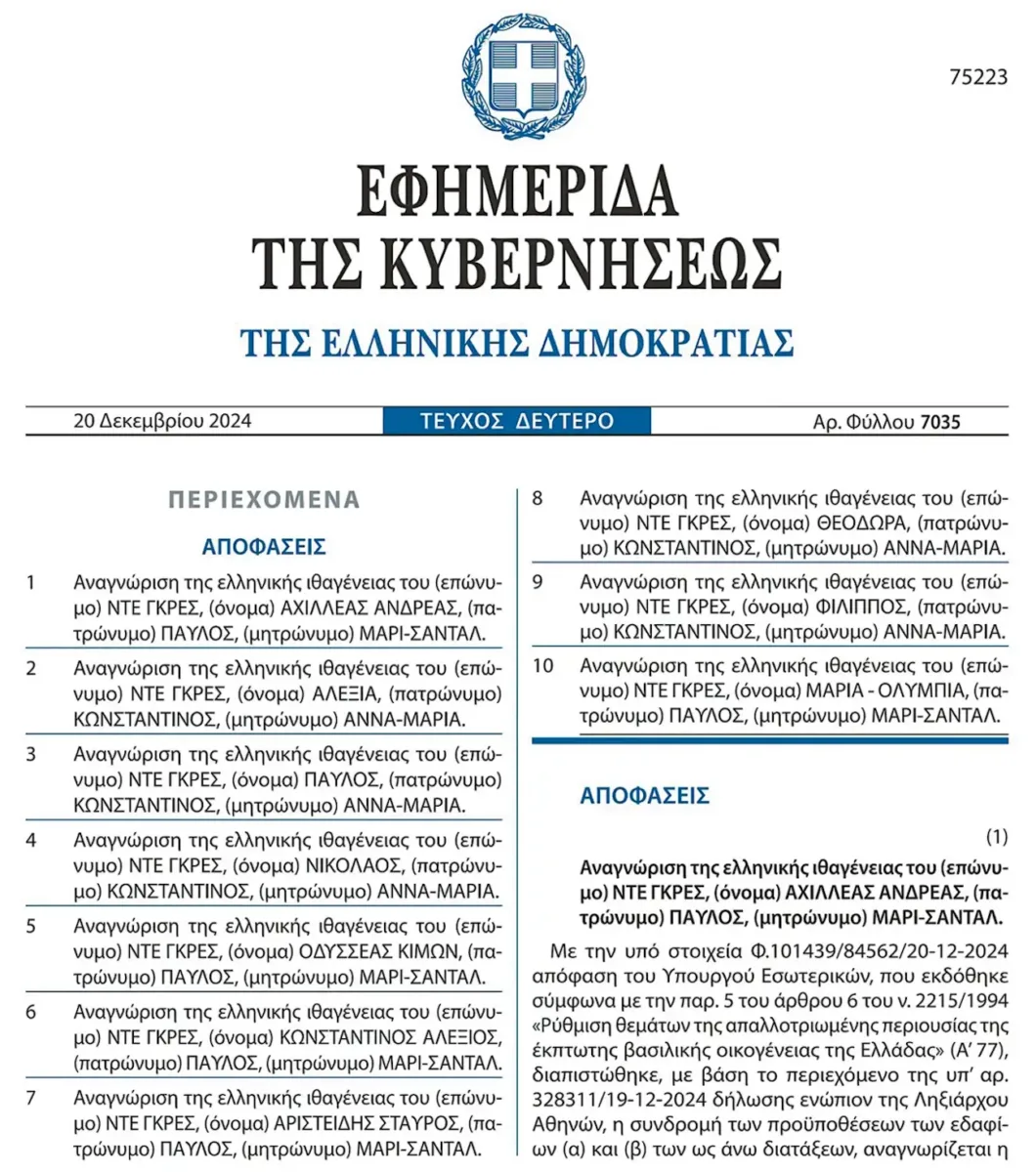 Σημειώνεται ότι στις 20 Δεκεμβρίου 2024 δημοσιεύθηκε στο φύλλο της Εφημερίδας της Κυβερνήσεων, η απόφαση του υπουργού Εσωτερικών, Θοδωρή Λιβάνιου, που αναγνωρίζει την ελληνική ιθαγένεια των μελών της οικογένειας του τέως βασιλιά Κωνσταντίνου. Παράλληλα με αυτήν την απόφαση δόθηκε εντολή για την εγγραφή τους στο δημοτολόγιο του Δήμου Αθηναίων, επιτρέποντάς τους να βγάλουν ελληνική ταυτότητα και διαβατήριο. Έως τότε είχαν δανέζικα. Επίσης, τα 10 μέλη της οικογένειας του τέως βασιλιά Κωνσταντίνου κατέθεσαν αίτηση για να τους δοθεί η ελληνική ιθαγένεια στο Ληξιαρχείο Αθηνών. Νωρίτερα, αποδέχθηκαν εγγράφως το Σύνταγμα και το πολίτευμα της χώρας, δηλώνοντας ότι δεν έχουν καμία αξίωση από το ελληνικό κράτος.