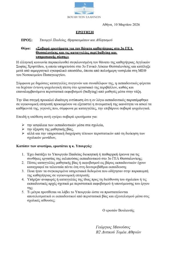 Ο Βουλευτής Β2 Δυτικού Τομέα Αθηνών Γεώργιος Μανούσος κατέθεσε κοινοβουλευτική ερώτηση προς το υπουργείο Παιδείας σχετικά με την τραγική υπόθεση της εκπαιδευτικού Σοφίας Χρηστίδου στο 3ο ΓΕΛ Θεσσαλονίκης.